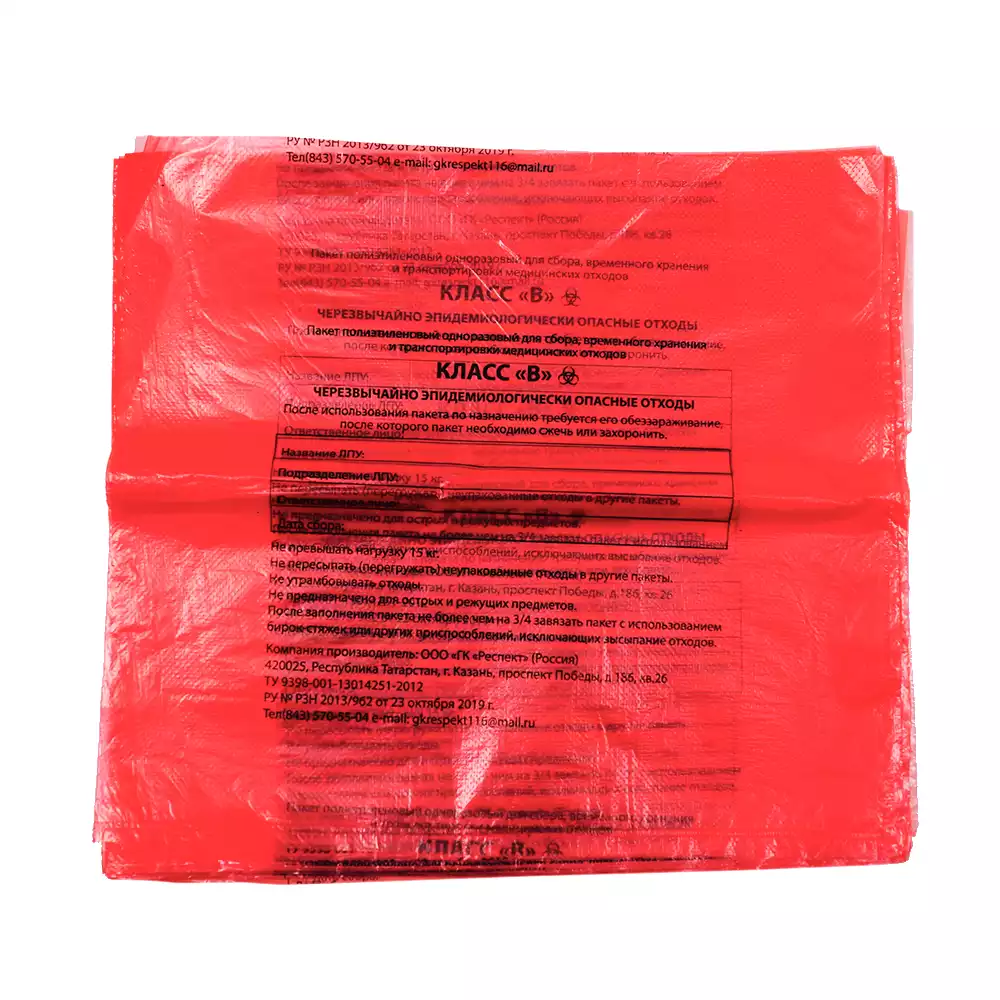 Пакет для сбора медицинских отходов, класс В (красный), размер 300*330мм, объем 5-6л, плотность 10 микрон, Респект ГК (РОССИЯ), 100 шт