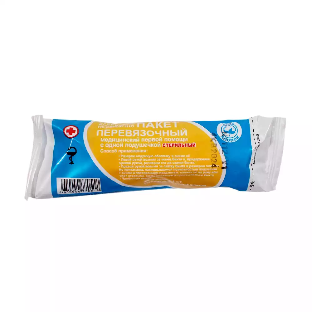 Пакет перевязочный медицинский 1-ой помощи с одной подушечкой, инивидуальный, с бинтом, стерильныйВерамед (РОССИЯ)