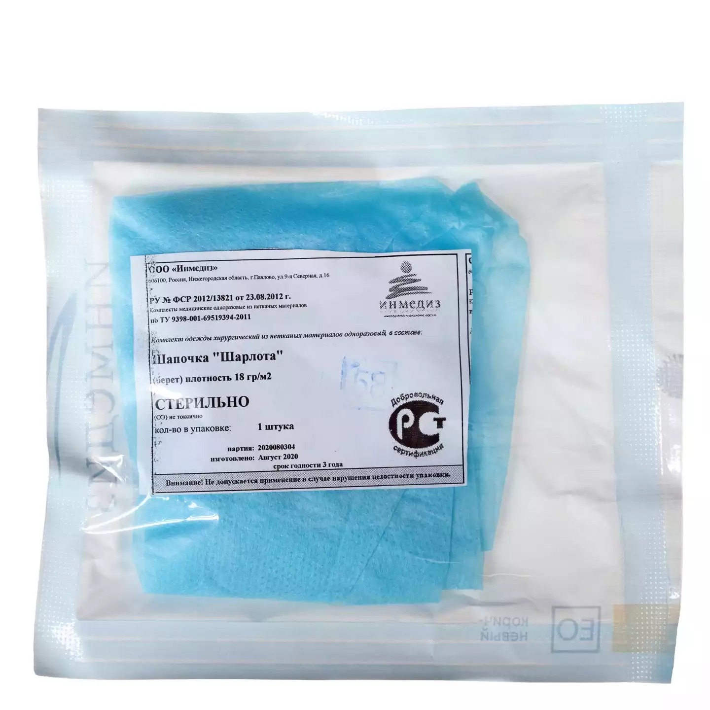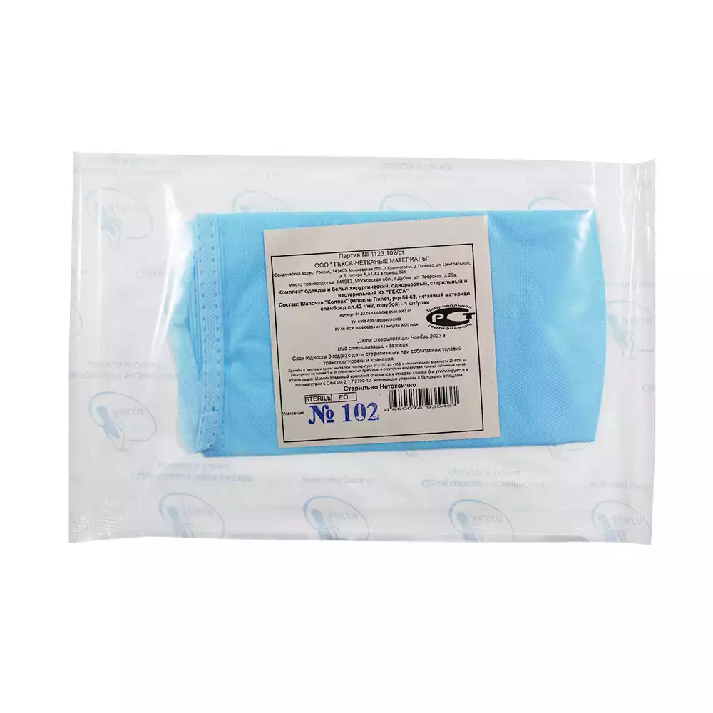 Шапочка-колпак, высота 18см, спанбонд 42г/м2, на завязках, р. 54-62, стерильная, цвет голубой, Гекса-нетканые материалы (РОССИЯ)